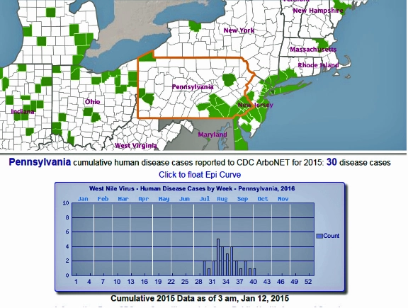 Although the risk of contracting serious illness from mosquitoes is low, there is still a risk. Much can be done to enable protection from mosquito-borne disease. This includes the reduction of breeding sites and standing water on your property and utilizing a professional mosquito control program. As reported by the Centers for Disease Control and Prevention (CDC), As of January 12, 2016, a total of 48 states and the District of Columbia have reported West Nile virus infections in people, birds, or mosquitoes in 2015. The graphic below outlines the human cases of Pennsylvania specific human WNV cases reported to the CDC for 2015. The total number of cases statewide is 30, of which both Chester and Montgomery reported human cases of the disease.